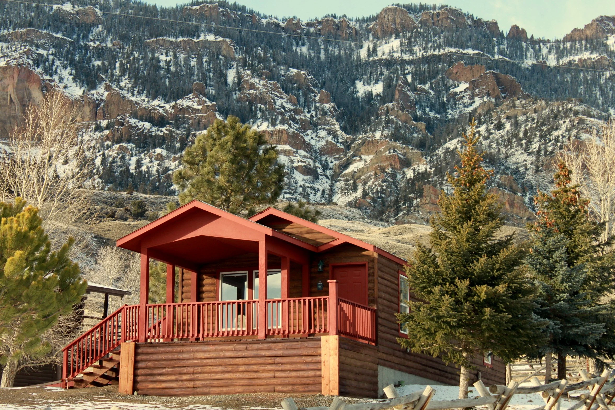 The Bighorn Cabin features a full kitchen with refrigerator, range/oven, microwave, coffee, dishwasher; hardwood floors, vaulted ceiling, two bedrooms, one bath with a shower/tub, laundry, a large front porch with amazing views, a large common area, and can accommodate five guests. One bedroom has a queen-sized bed; the other bedroom has twin-sized bunk beds; the common area has a roll-out twin bed.